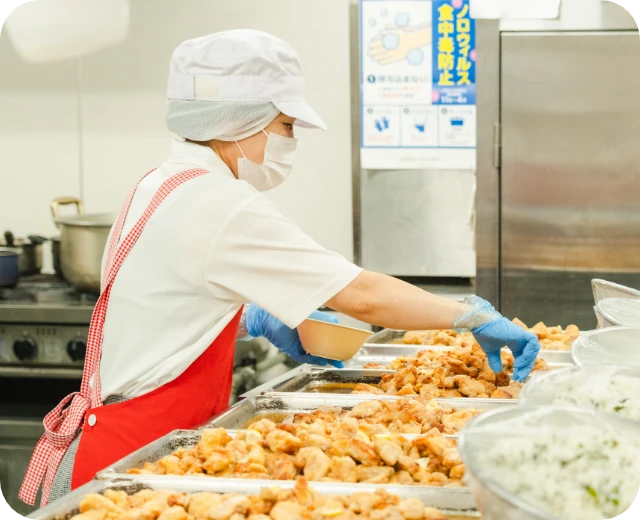 みみづく保育園では園内で調理した、できたての給食を提供しています。園舎正面にある調理室はガラス張りで、子ども達が毎日食べている給食がどのように作られているのか調理風景を見ることができます。