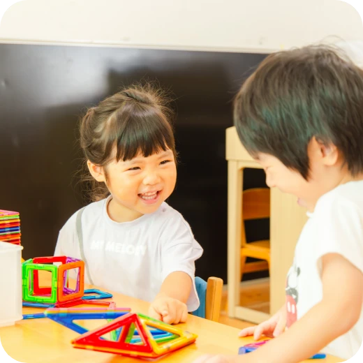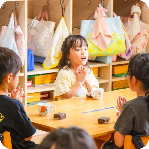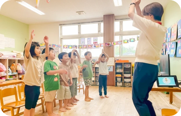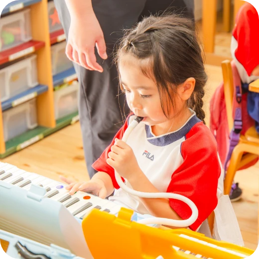 感性や運動能力の発達に加え、情緒の安定や、想像力・集中力・思考力の育成を目指しています。お友達と一緒にリトミックを経験する中で、協調性や連帯感も育んでいます。リトミック講師の先生に来ていただいています。