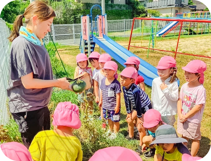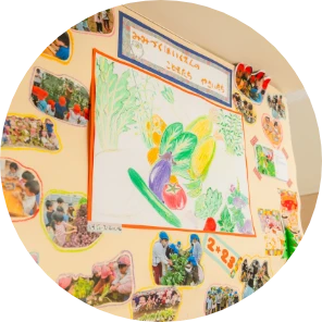 年に2回、夏と冬に子どもたちと野菜を育て収穫しています。収穫後は、調理室で調理をしていただき給食の時間にいただきます。自分たちの手で育てた野菜は格別においしいようで普段苦手な野菜もおいしいと食べる姿も見られ貴重な経験となっています。