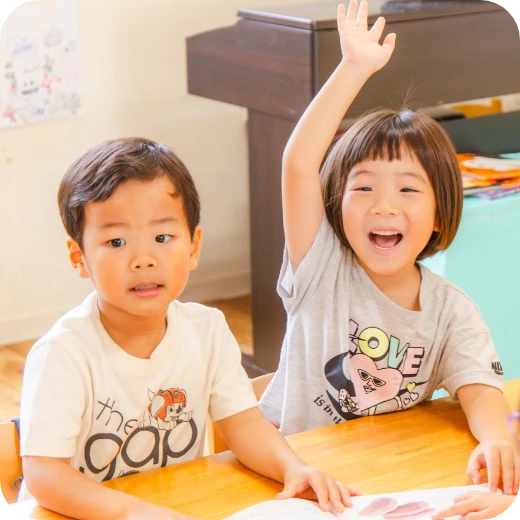 週に一度、外国人講師の先生から英語に親しむ時間を設けています。ダンスや歌を歌ったり、ビンゴや色を塗ったりして遊びながら楽しい時間を過ごしています。